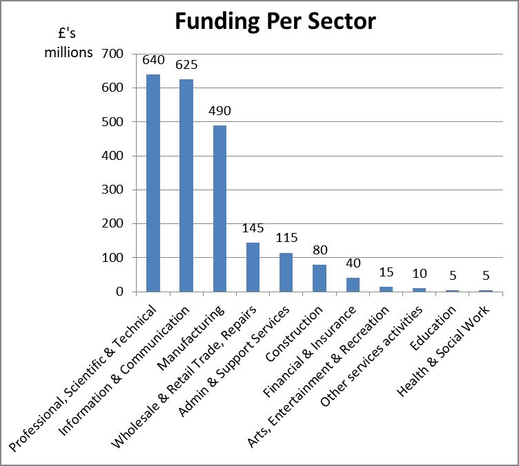 The sector in London that received most funding was Information & Communication – which will include the Fintech and Software development companies based in London.